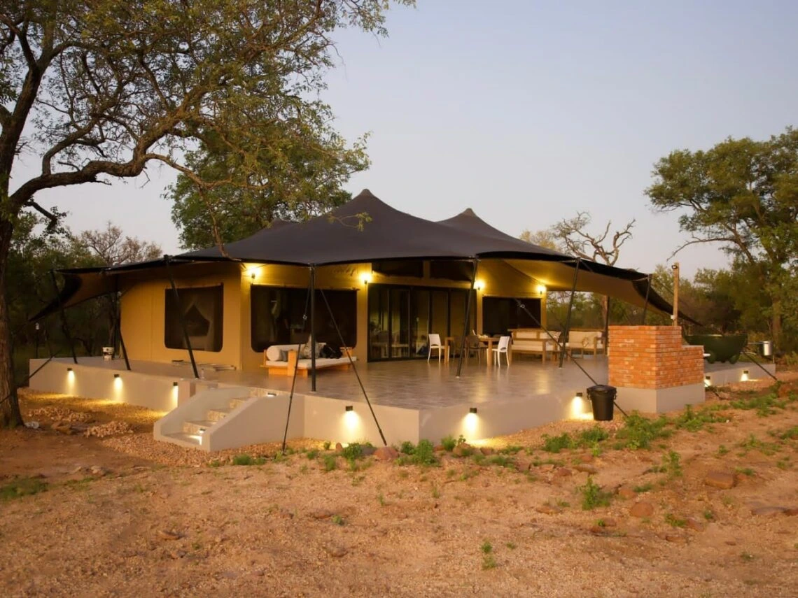 Create a complete luxury camping destination with accommodations, dining, and amenities.