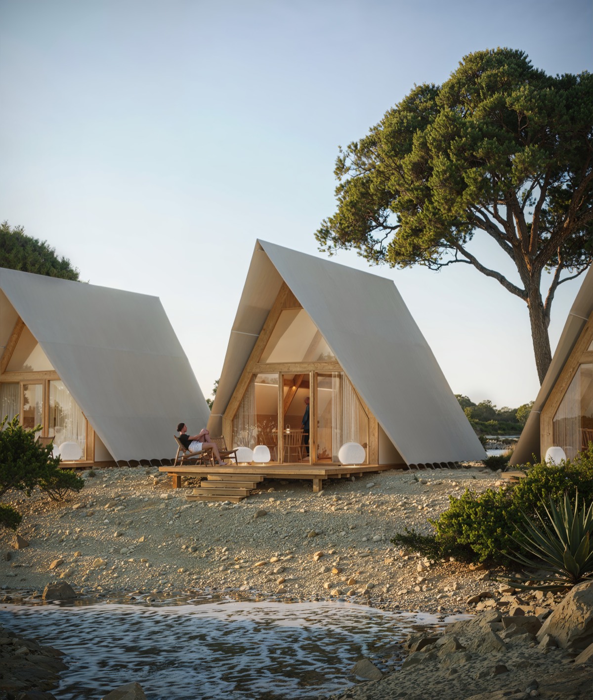 The cabins are distinguished by their gable roofs and facades made of natural boards, which give them a warm, harmonious character. Large glass windows bring in plenty of light, while simultaneously opening the interiors to the surrounding nature.