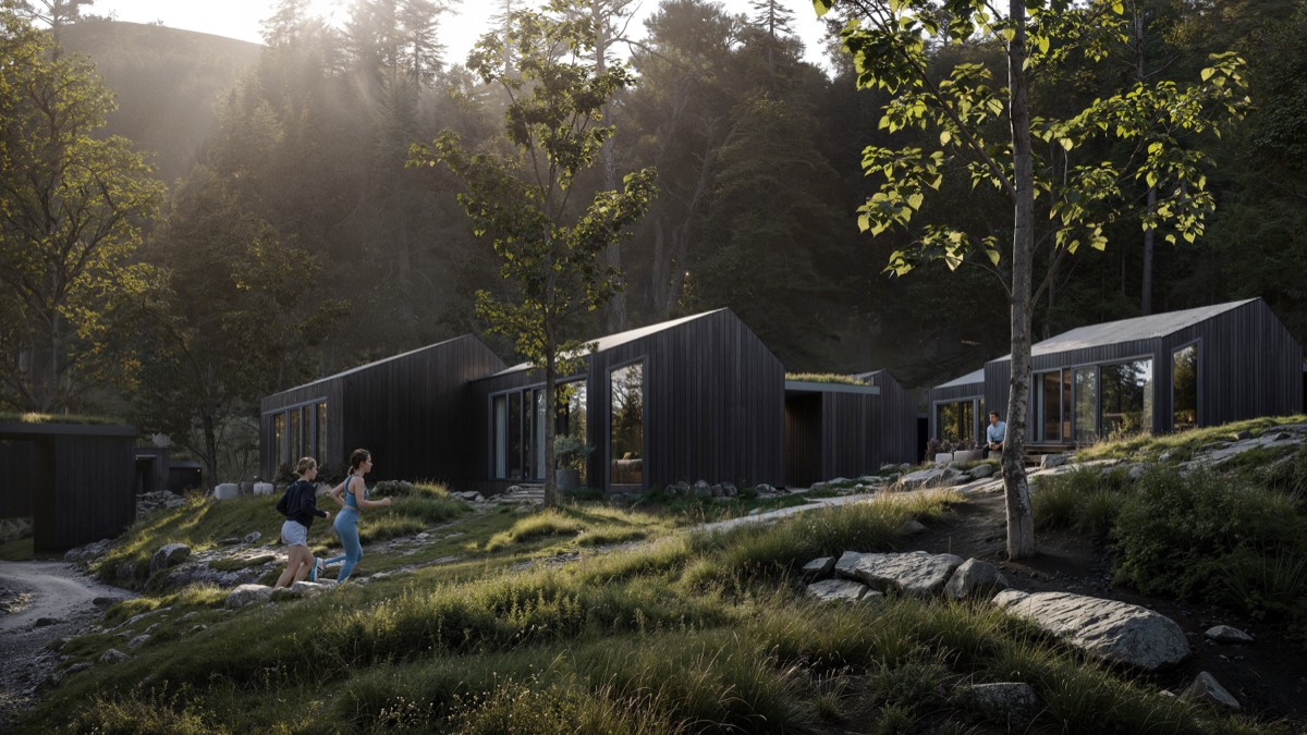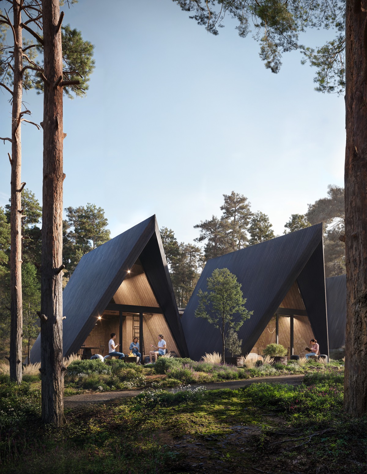 The cabins are distinguished by their gable roofs and facades made of natural boards, which give them a warm, harmonious character. Large glass windows bring in plenty of light, while simultaneously opening the interiors to the surrounding nature.